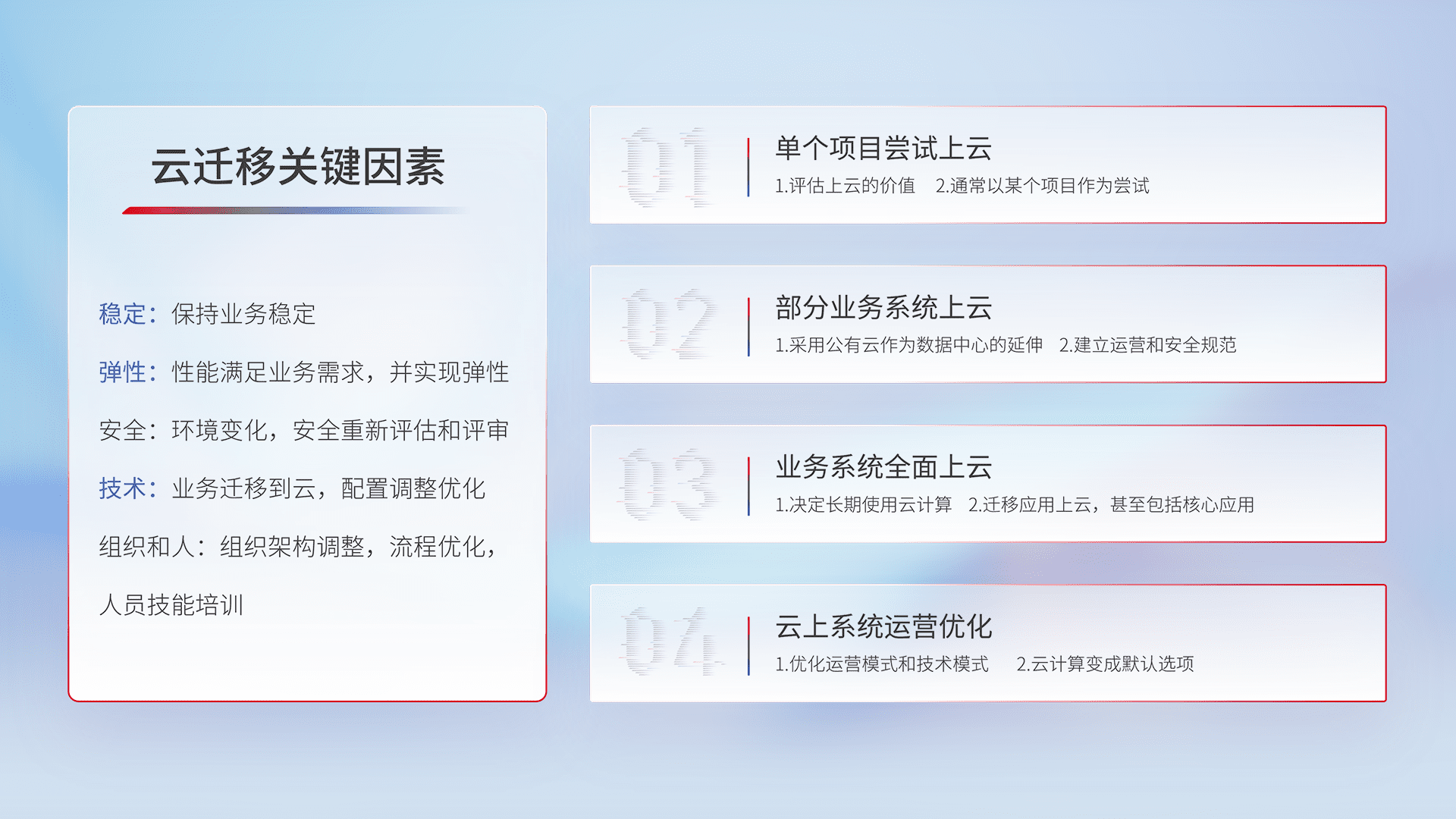 结合实际业务,,,从规划设计、、、云平台选型、、、、云原生改造、、、数据迁移、、集成交付,,迁移全过程为客户识别最佳上云路径,,,做好风险识别管理,,,设计网络架构、、身份权限、、安全审计合规、、操作审计、、、日志审计、、监控告警策略、、、、多站点容灾设计等,,,对云上基础设施进行整体规划,,,,提升IT治理水平,,以满足弹性、、高可用、、高性能的需求。。。