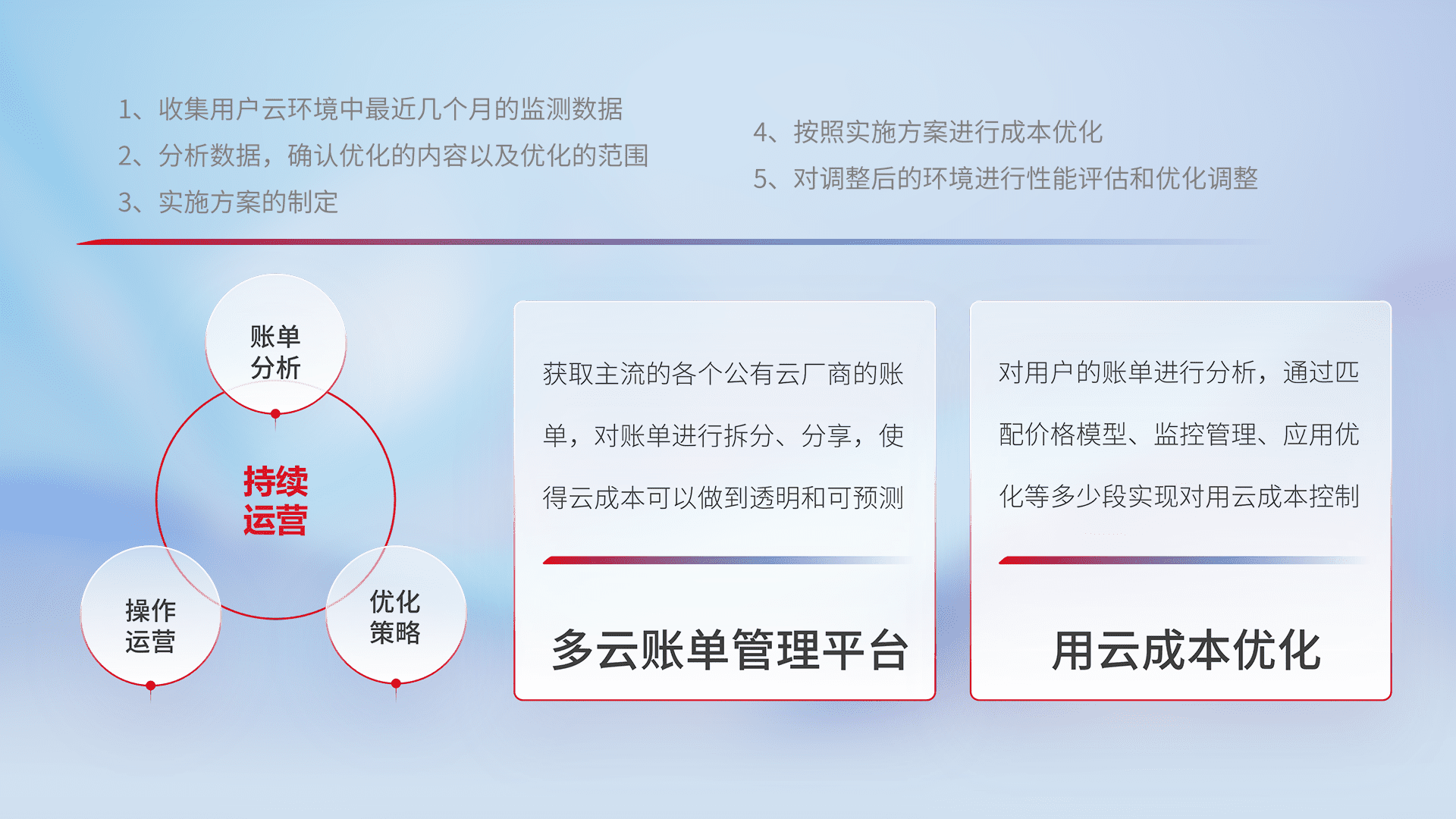 通过多云纳管,,,以统一的资源数据模型把客户的云资源进行抽象和封装,,进而实现对多云资源的统一操作,,保障云资源管理的可靠性、、稳定性与可用性。。。量身定制化运维内容,,配置、、开发运维、、、补丁管理、、备份、、监控、、、、认证和访问管理、、审计和日常巡检等,,保障在用云过程中的可靠度,,稳定度以及高可用率。。。